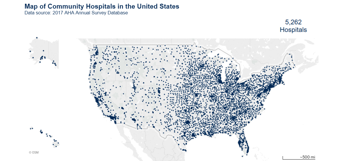 Here is another map, this one of the locations of Hospitals in the USA according to 2017 data from the American Hospital Association: